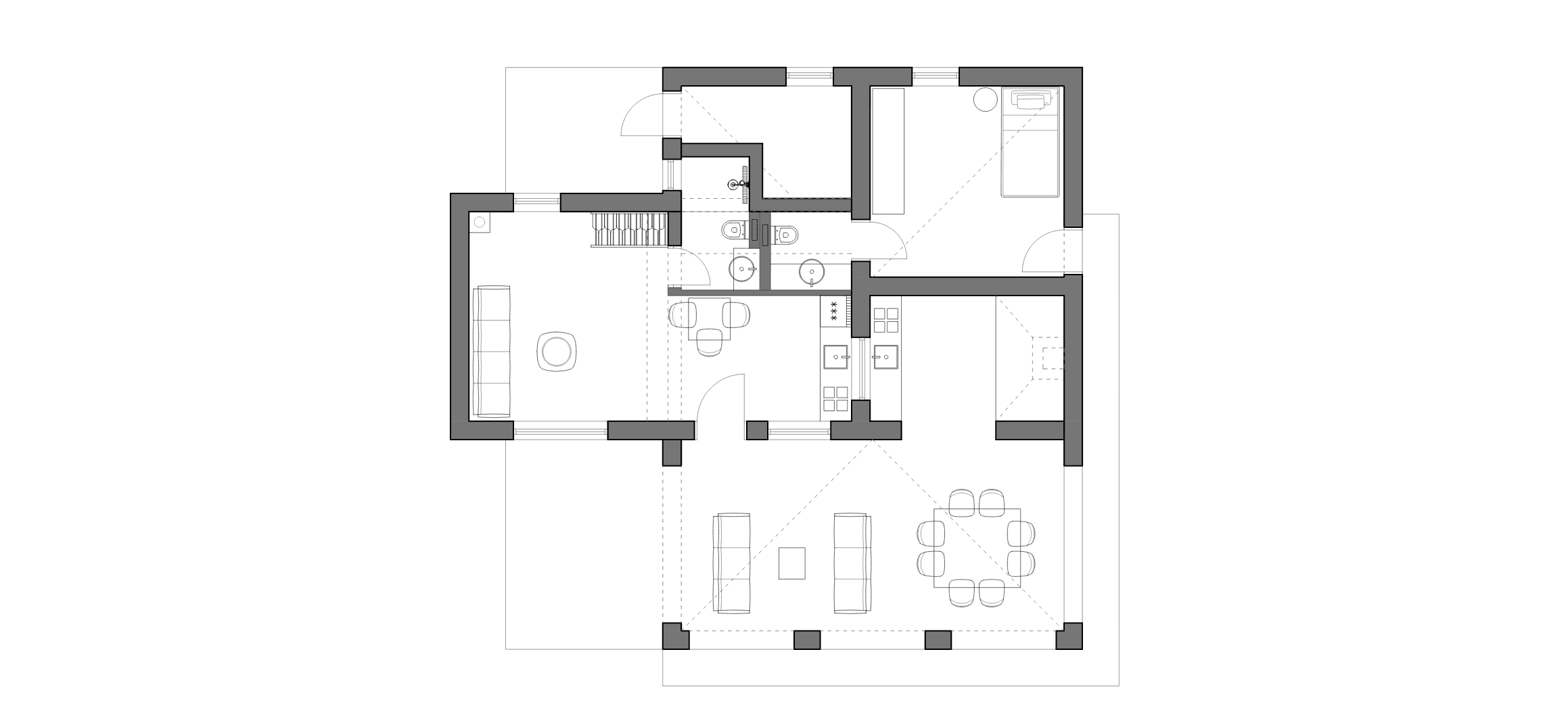 Pozivajući se na logiku oblikovanja tradicionalnih dalmatinskih kuća, ostvarena su dva volumena koji se preklapaju i od kojih svaki udomljava svoj tip prostora.