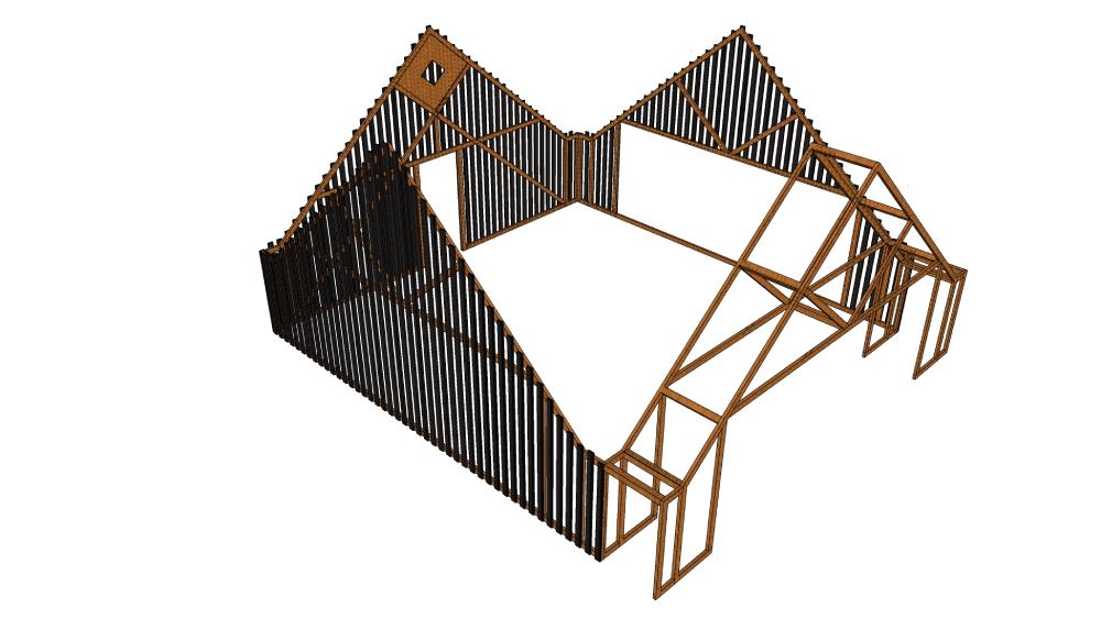 Jugozapadno pročelje simbolizira ruševnost i postepen nestanak – vanjska ovojnica se fragmentira, staklene stijene postaju dominantne, a materijalnost drva i dalje odolijeva vremenu, postajući dio pejzaža.