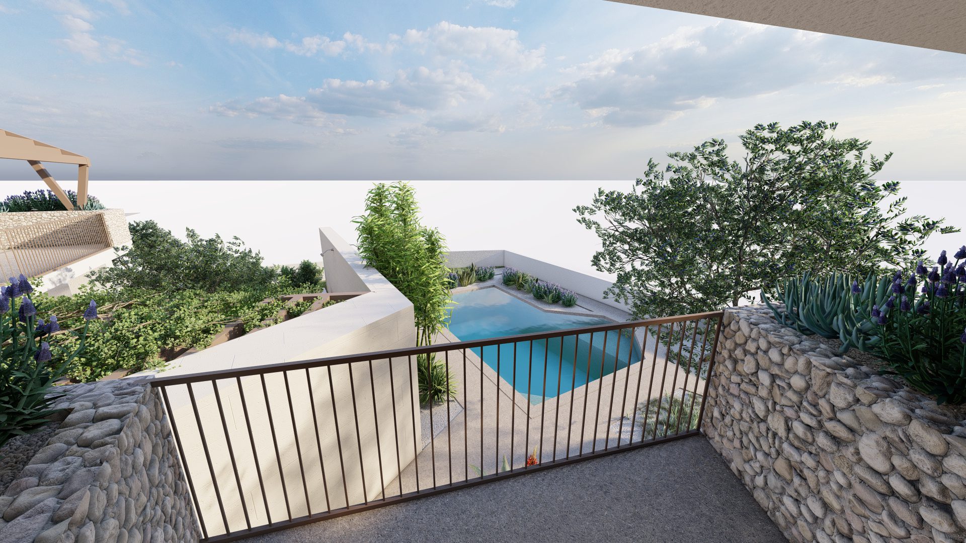 Jugoistočno pročelje donosi proboj modernih elemenata – veliki otvori i staklene stijene razbijaju vanjsku ovojnicu, dok se prirodni elementi poput vode i zelenila pojavljuju unutar strogo definirane geometrije.