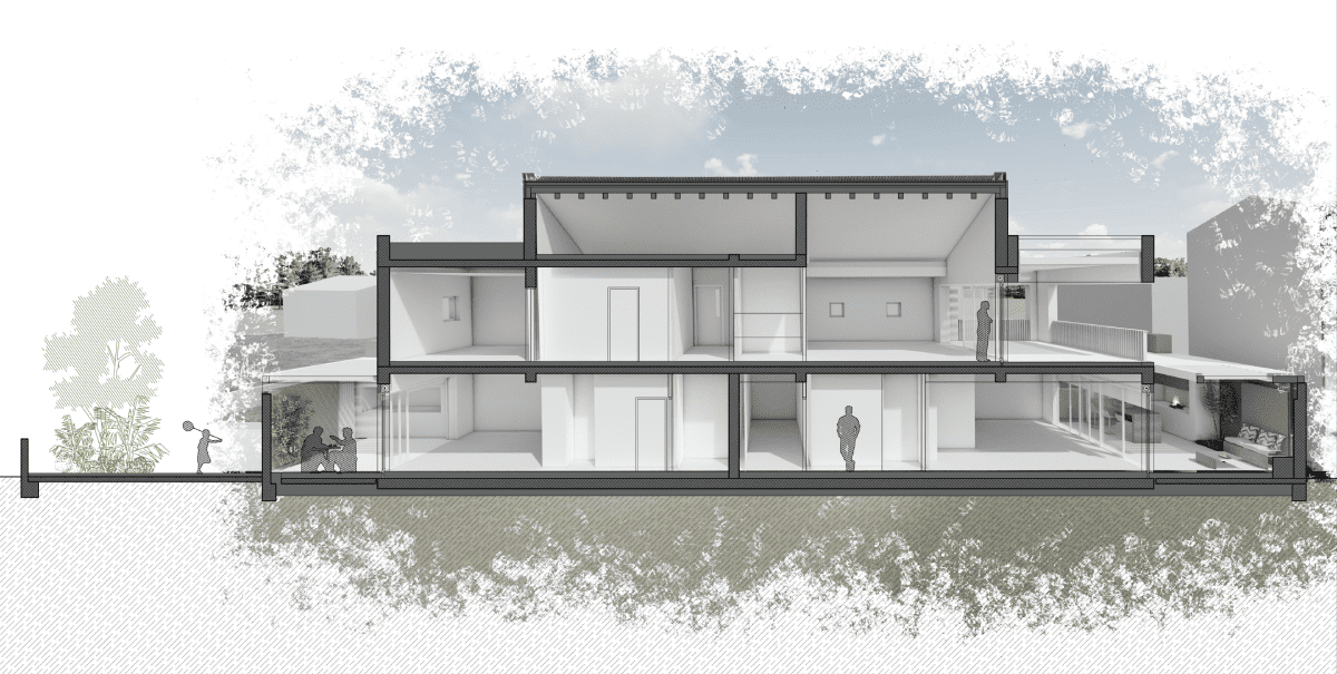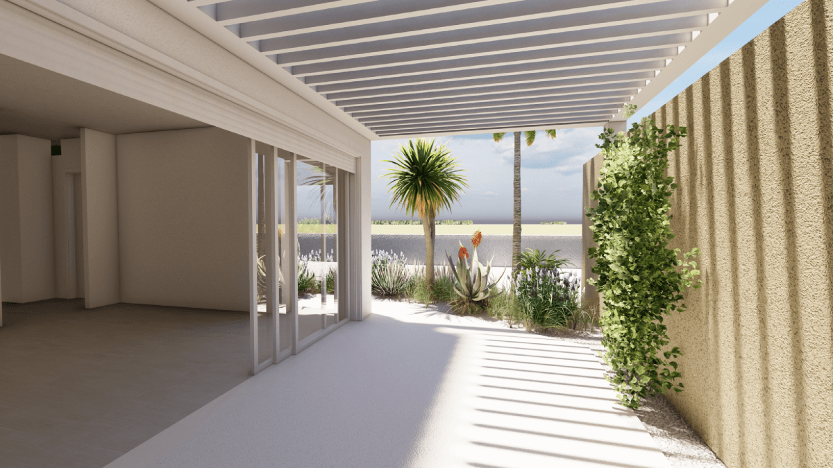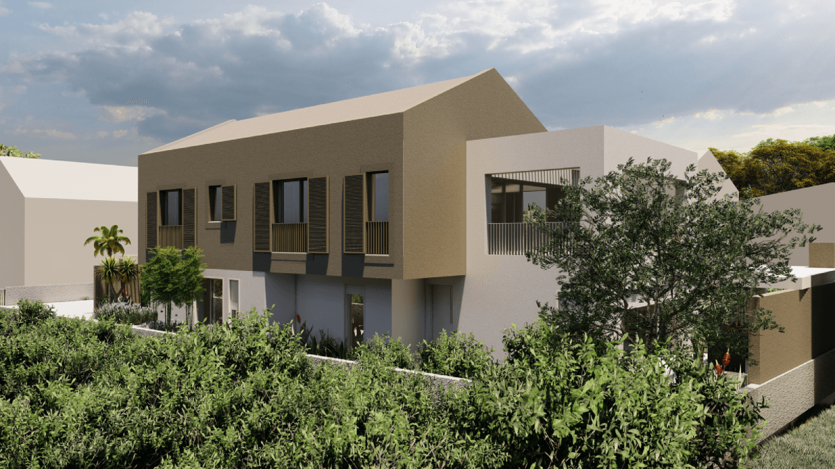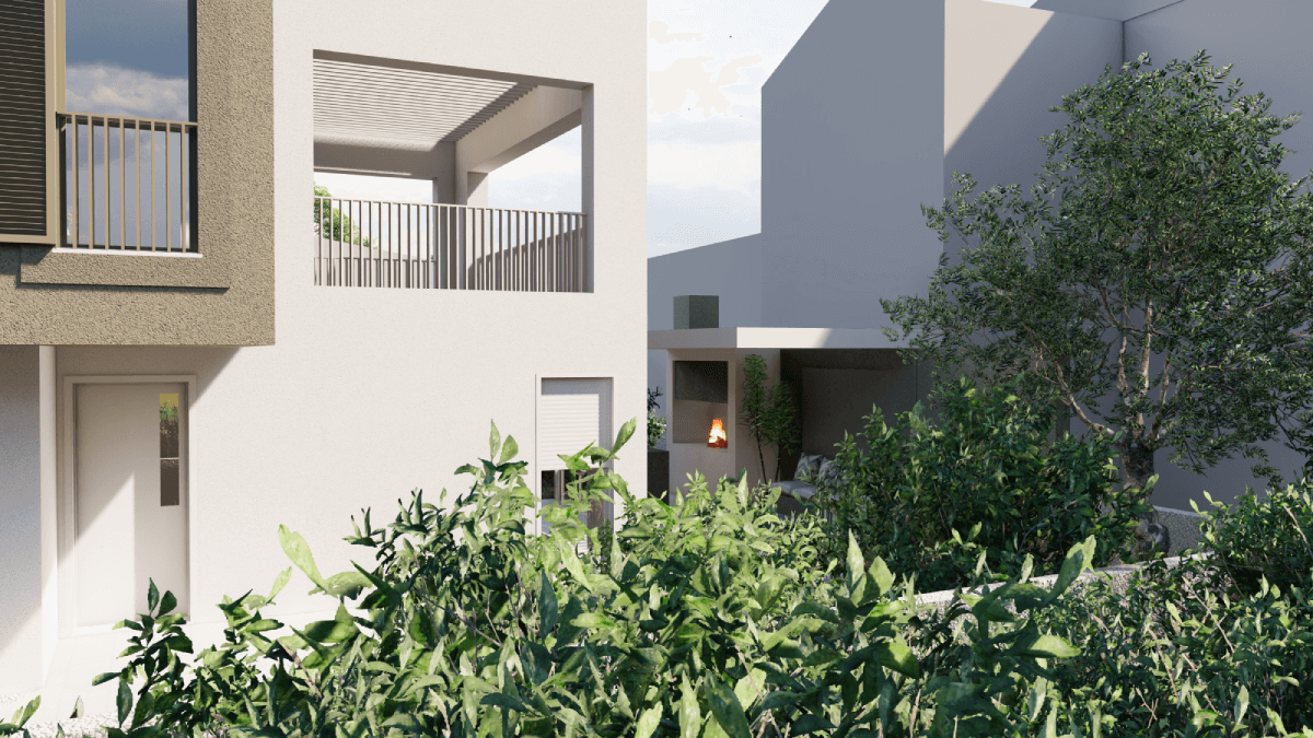 Volumen sekundarnog sadržaja za najam je u bijeloj žbuci i okružen zelenilom sa što više strana radi ostvarivanja optimalne mikroklime i privatnosti.