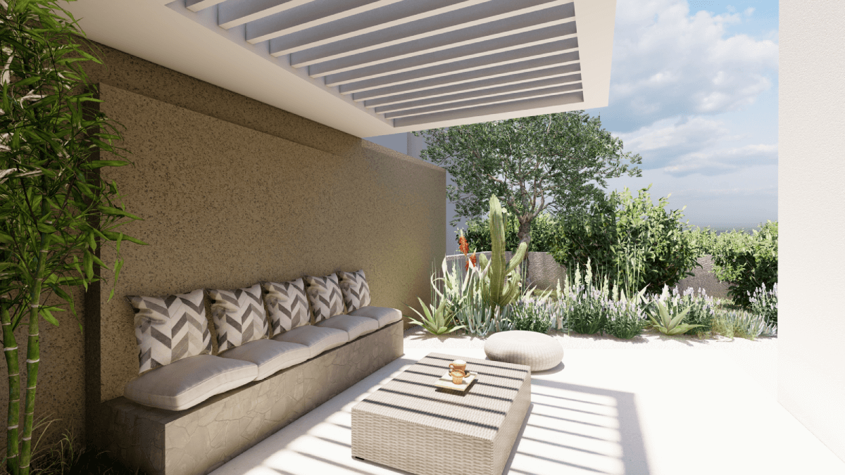 Prizemne jedinice tvore neutralnu bazu na kojoj se ističe stambeni prostor s dodatnom sobom i natkrivenom terasom.